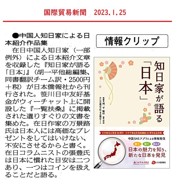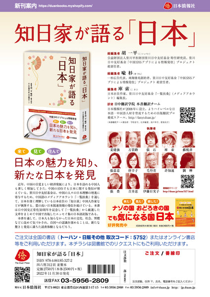 近年、中国の目覚ましい経済発展により、日本を訪れる中国人も著しく増加してきた。中国のSNSでも日本に関する発信が増えている。笹川日中友好基金は、中国の人々の日本理解の増進に寄与するため、中国語のメディアアカウント「一覧扶桑」を通して、日本を深く理解している日本在住の「知日派」中国人作家などが執筆する、質の高い日本関連情報の発信を続けている。本書は日中国交正常化50周年を記念して「一覧扶桑」から厳選した文章をまとめて中国で出版したエッセイ集の日本語訳版である。