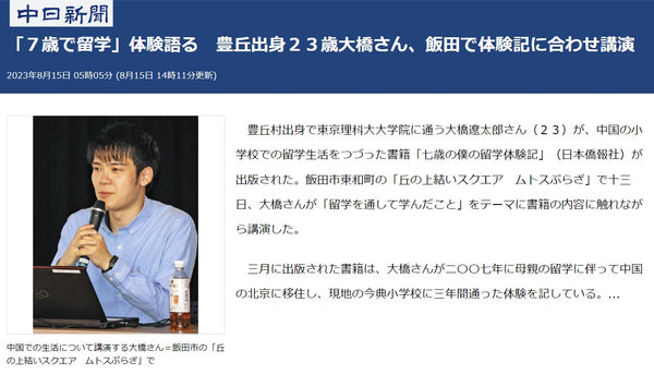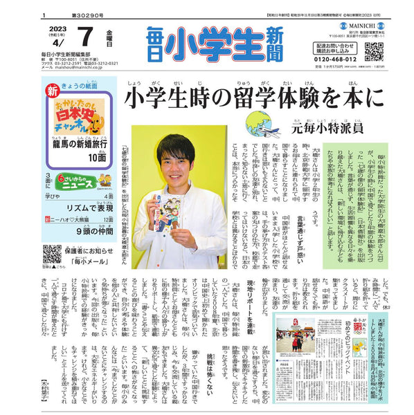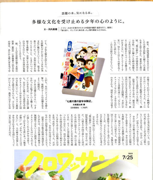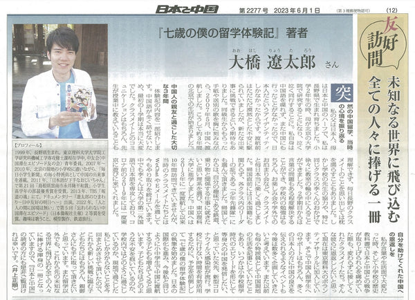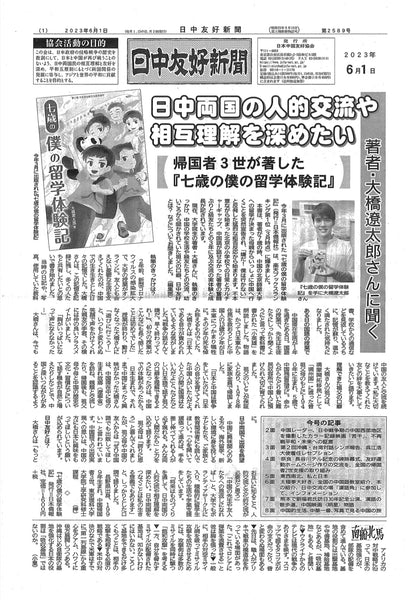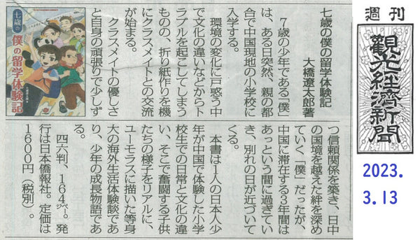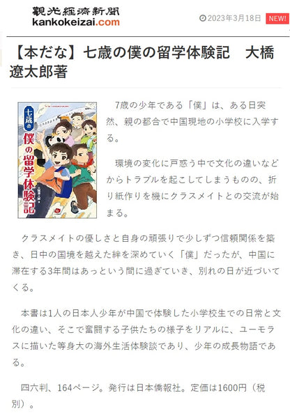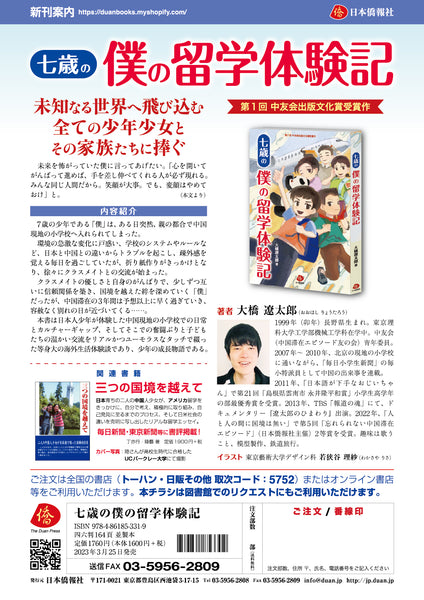 【書誌情報】 七歳の僕の留学体験記 著 者 大橋 遼太郎(おおはし りょうたろう) 挿 画 若狭谷 理紗(わかさや りか) 発行者 段 景子 出 版 株式会社 日本僑報社 判 型 四六判 164頁 並製本 定 価 1600円+税 発売日 2023年 3月25日 ISBN 978-4-86185-331-9