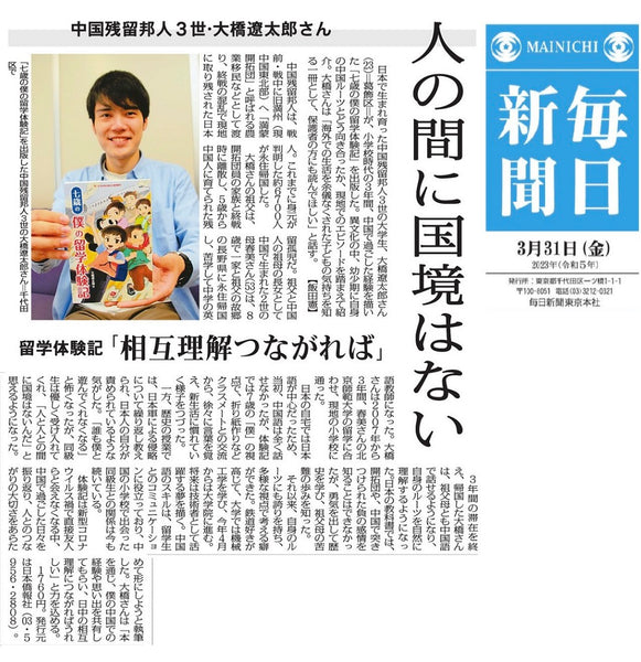 【著者紹介】 著 者 大橋 遼太郎(おおはし りょうたろう) 1999年(卯年)長野県生まれ。東京理科大学工学部機械工学科在学中。中友会(中国滞在エピソード友の会)青年委員。 2007年~2010年、北京の現地の小学校に通いながら、「毎日小学生新聞」の毎小特派員として中国の出来事を連載。 2011年、「日本語が下手なおじいちゃん」で第21回「島根県雲南市 永井隆平和賞」小学生高学年の部最優秀賞を受賞。2013年、TBS「報道の魂」にて、ドキュメンタリー『遼太郎のひまわり』出演。2022年、「人と人の間に国境は無い」で第5回「忘れられない中国滞在エピソード」(日本僑報社主催)2等賞を受賞。 趣味は歌うこと、模型製作、鉄道旅行。